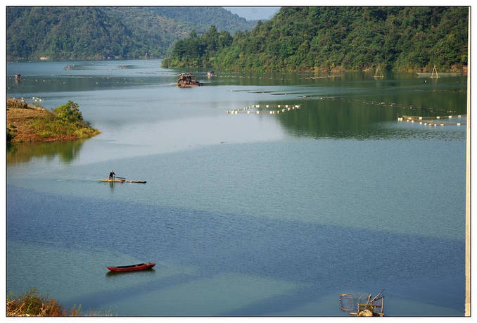 不知過了多久!也不知穿過了多少座隧道!我依然沉浸在遠(yuǎn)離凡塵喧囂的鬧市、相伴于群山峻嶺,四季如春綠油油松柏夾雜著少許紅楓秋葉的幻想之中,間或在轉(zhuǎn)瞬即逝日薄西山的余暉照映下熠熠生輝!此時(shí)此刻的我已經(jīng)是到了忘我的最高境界,腦中忽然閃過歐陽老翁的一句至理名言——【醉翁之意不在酒,而在乎山水之間!】這句話用在此處真的是妙不可言!我那萬千思緒隨著飛馳的車輪早已飄到九霄云外,暗自為窗外如畫如詩的景象所迷惑、所陶醉、所依戀...!猛然間聽到一句非常熟悉且溫暖的話——爸爸!快看!到了磨子潭風(fēng)景觀賞區(qū)了!我才恍然如夢(mèng)驚醒,朝遠(yuǎn)處向下望去好一個(gè)一望無際的“磨子潭”!其潭水清澈,魚影可現(xiàn);微風(fēng)襲來,碧波蕩漾;譚中游筏,漁歌互答;這時(shí)女兒也詩意助興了!滿懷深情地吟誦——“磨子潭水-深千尺,不及‘爸媽’-送我情!”這句真是太絕了!女兒漸漸地長(zhǎng)大了,懂得感恩戴德了。車子終于快要鉆進(jìn)最后一個(gè)隧道了,我也不知道它是排第幾?感覺今天好像是專乘“高速隧道”之旅了?!在快要進(jìn)入末了隧道的一霎那,我還特留戀地回頭朝窗外俯視一下,只見磨子潭中那無數(shù)的‘網(wǎng)箱’把整個(gè)潭水劃分成大小不等的方塊,好像一張碩大無比殘缺不全的圍棋盤面撒在幽深的譚中,我還來不及細(xì)數(shù)就立刻消失在我難以忘卻的視線中.....!