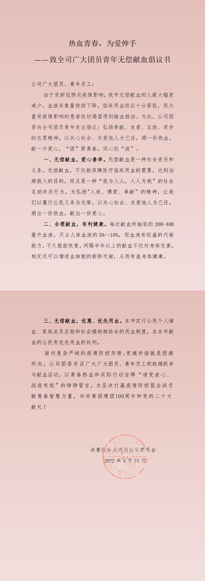 致全司廣大團(tuán)員青年無償獻(xiàn)血倡議書