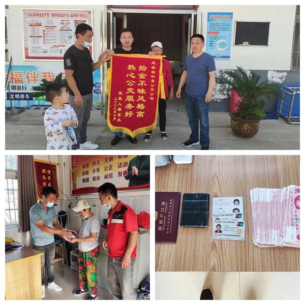 事情是這樣的,2022年6月4日下午,宿松城市5路公交車到終點站,駕駛員黎石保在乘客下車后對車輛進行清潔消毒時,突然發(fā)現(xiàn)車廂座位上有一個黃色布袋。打開一看布袋里有個黑色皮包,皮包內(nèi)有現(xiàn)金、身份證、社?ǖ取@枋T氐却欢螘r間,失主一直沒有出現(xiàn)。公交班車回站后,依照公司相關(guān)管理規(guī)定,黎石保第一時間將布袋上交公司。經(jīng)工作人員清點,內(nèi)有現(xiàn)金4700元,2張身份證、2張社保卡,以及一本存款1.6萬的存折。