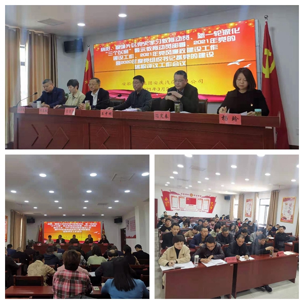 2021年3月18日下午,公司在潛山分公司會(huì)議室組織岳西和潛山兩片區(qū)單位領(lǐng)導(dǎo)班子成員及黨員代表參加,合并召開(kāi)了黨史學(xué)習(xí)教育動(dòng)員、新一輪深化“三個(gè)以案”警示教育部署、2021年黨的建設(shè)工作、2021年黨風(fēng)廉政建設(shè)工作暨2020年度黨組織書(shū)記抓黨的建設(shè)述職評(píng)議工作會(huì)議。公司領(lǐng)導(dǎo)王中明、馮定春、左普慶出席會(huì)議。