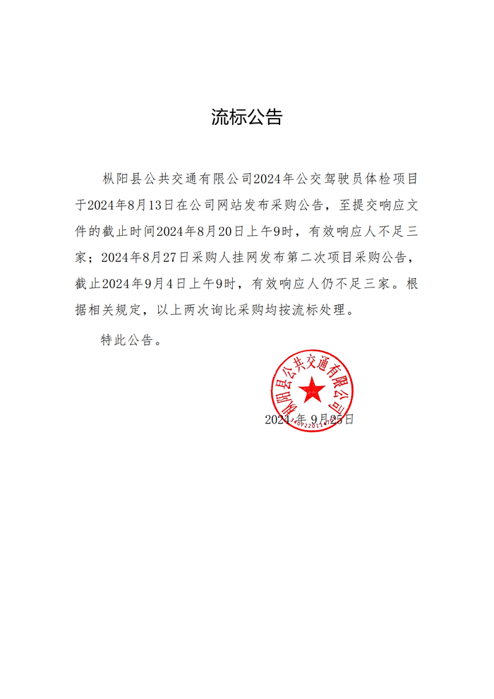 樅陽公交駕駛員體檢項目流標公告