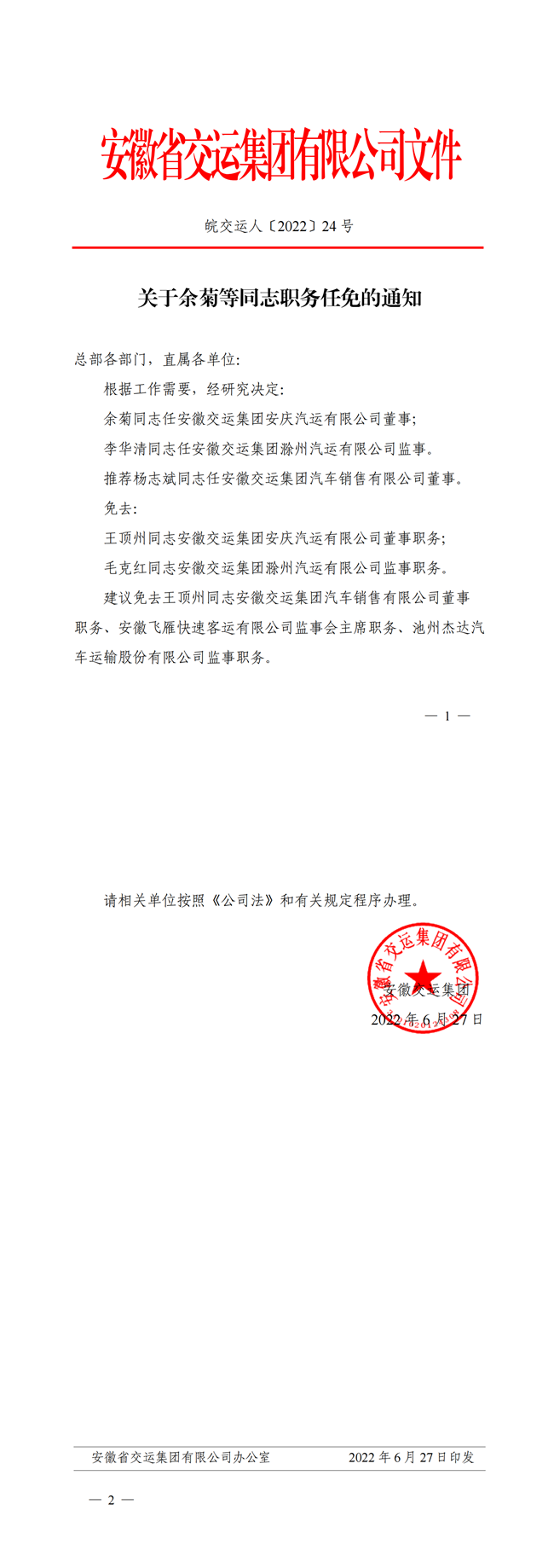 關(guān)于余菊等同志職務(wù)任免的通知